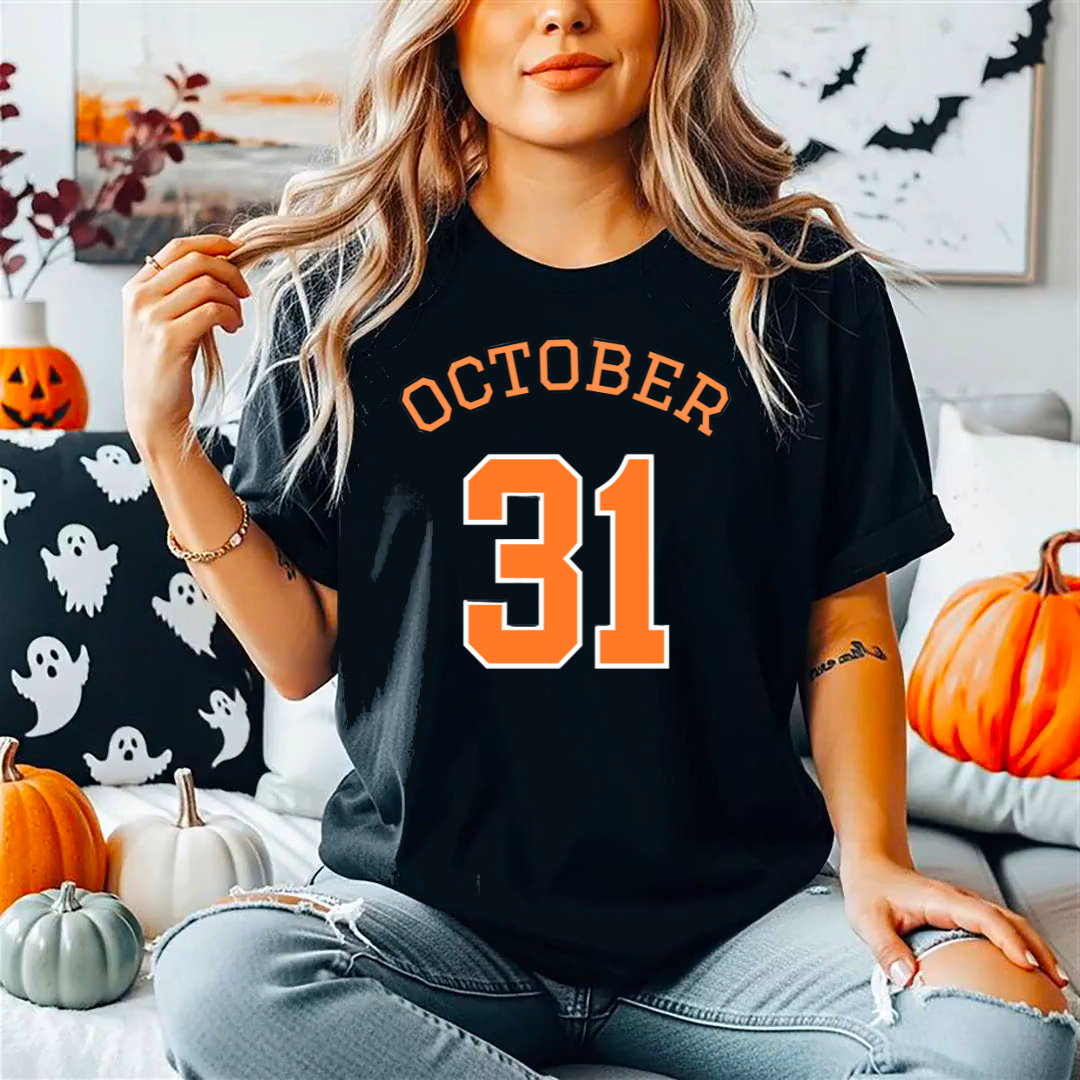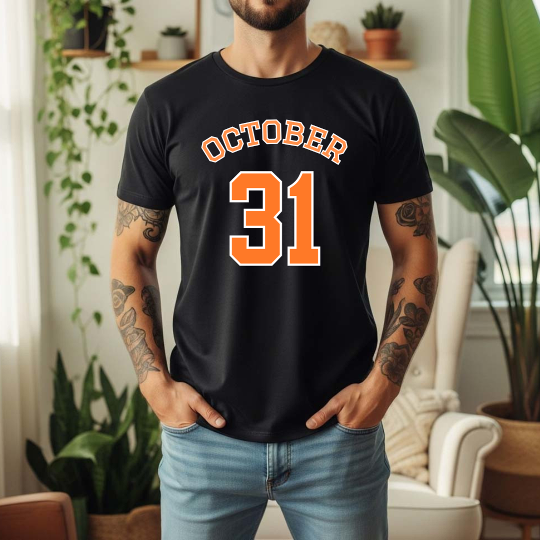 Our October 31 T-shirt features a clean, bold sports-inspired design, perfect for fans of minimalist seasonal style, varsity fashion, and autumn vibes.