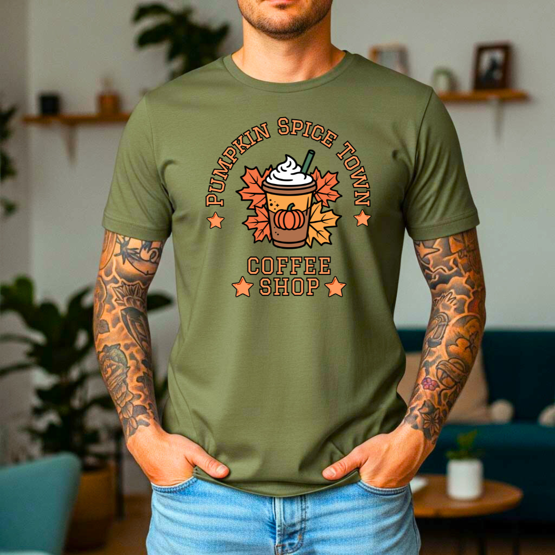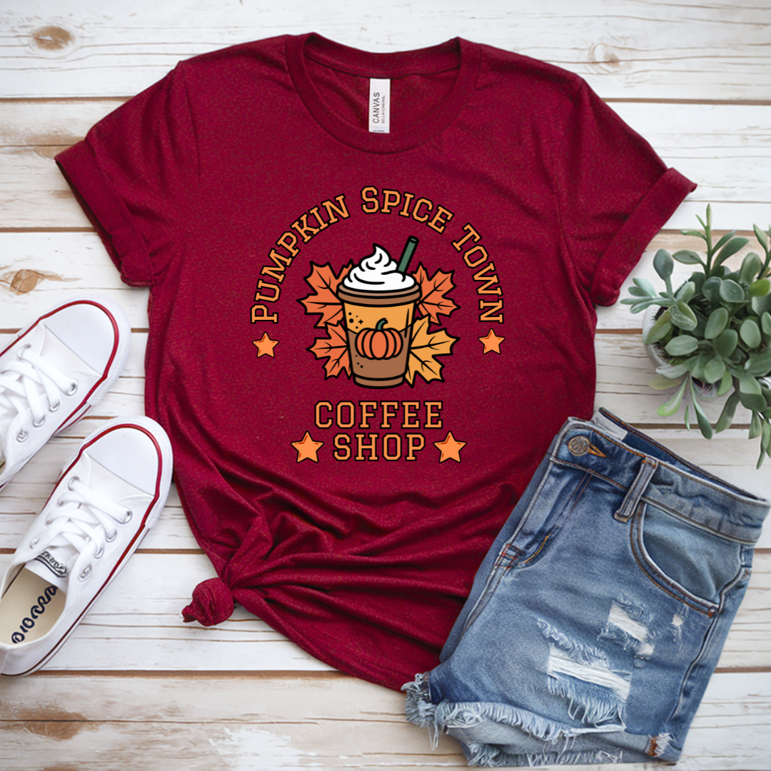 Pumpkin Spice Town Coffee Shop T-Shirt | Unisex Cozy Autumn Graphic Tee | Varsity Fall Style