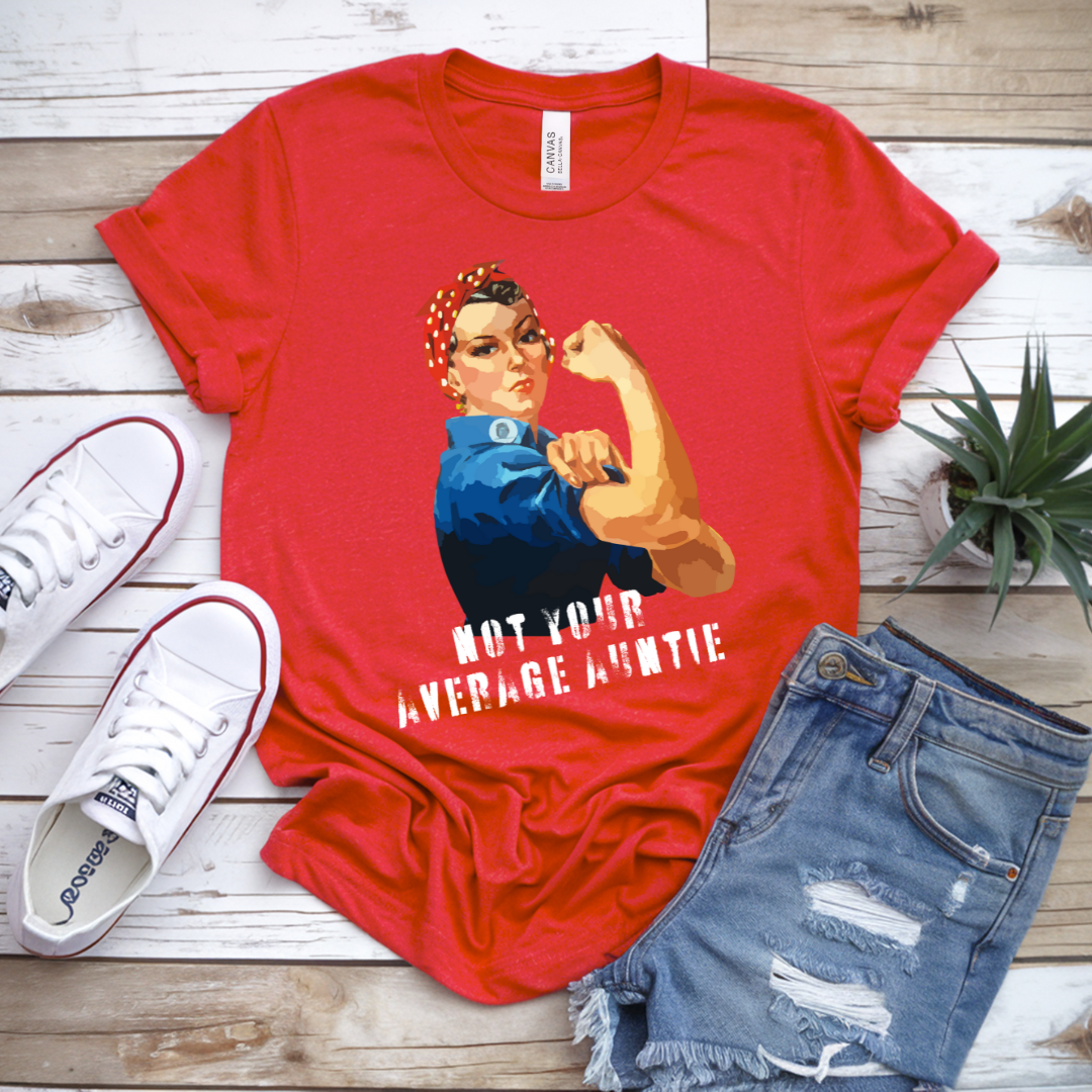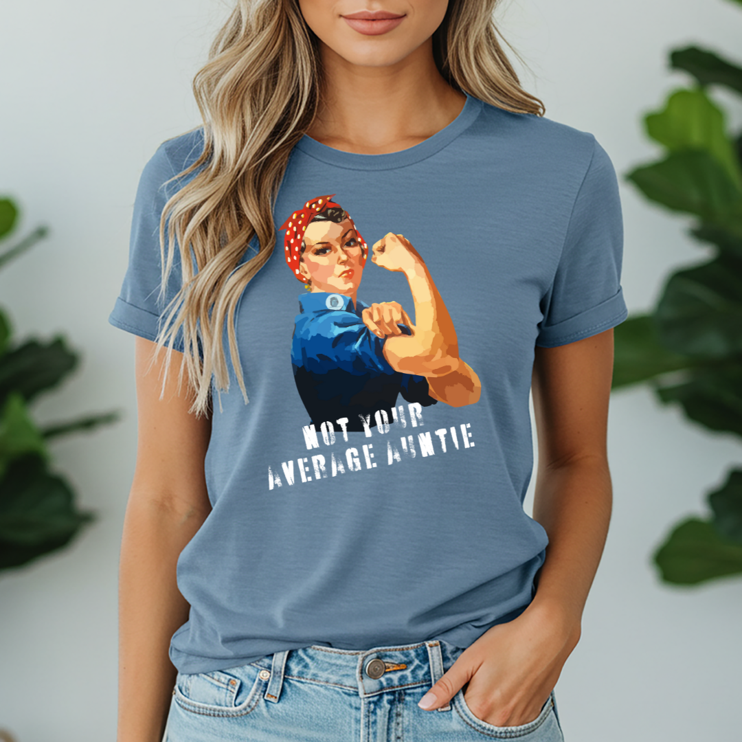 Fierce. Fun. Unforgettable. This 'Not Your Average Auntie' T-shirt brings serious power with a playful twist. Featuring the classic Rosie the Riveter, a nod to vintage feminist strength, this design celebrates confident, bold aunties who don’t play by anyone’s rules.