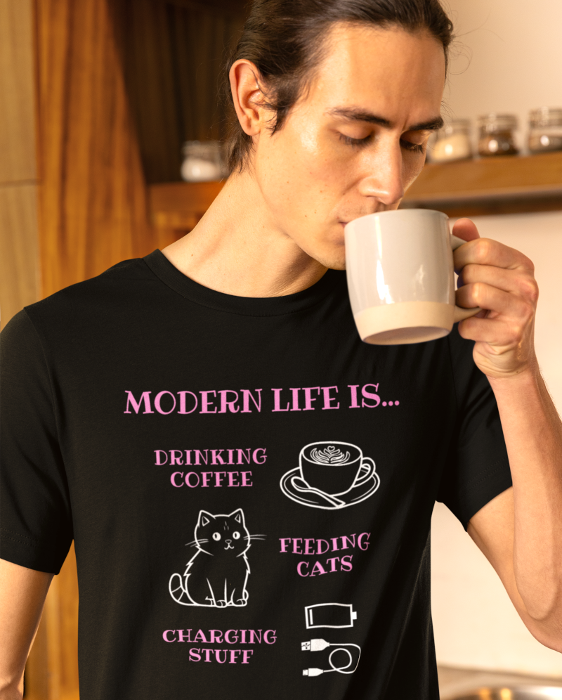 Featuring the playful phrase 'Modern Life Is Drinking Coffee, Feeding Cats and Charging Stuff,' this comfy, soft tee is perfect for cat lovers, tech multitaskers, and anyone who embraces the chaos with a smile. Whether you're a proud cat parent, a caffeine connoisseur, or just trying to keep your phone alive, this design brings joy to everyday routines.